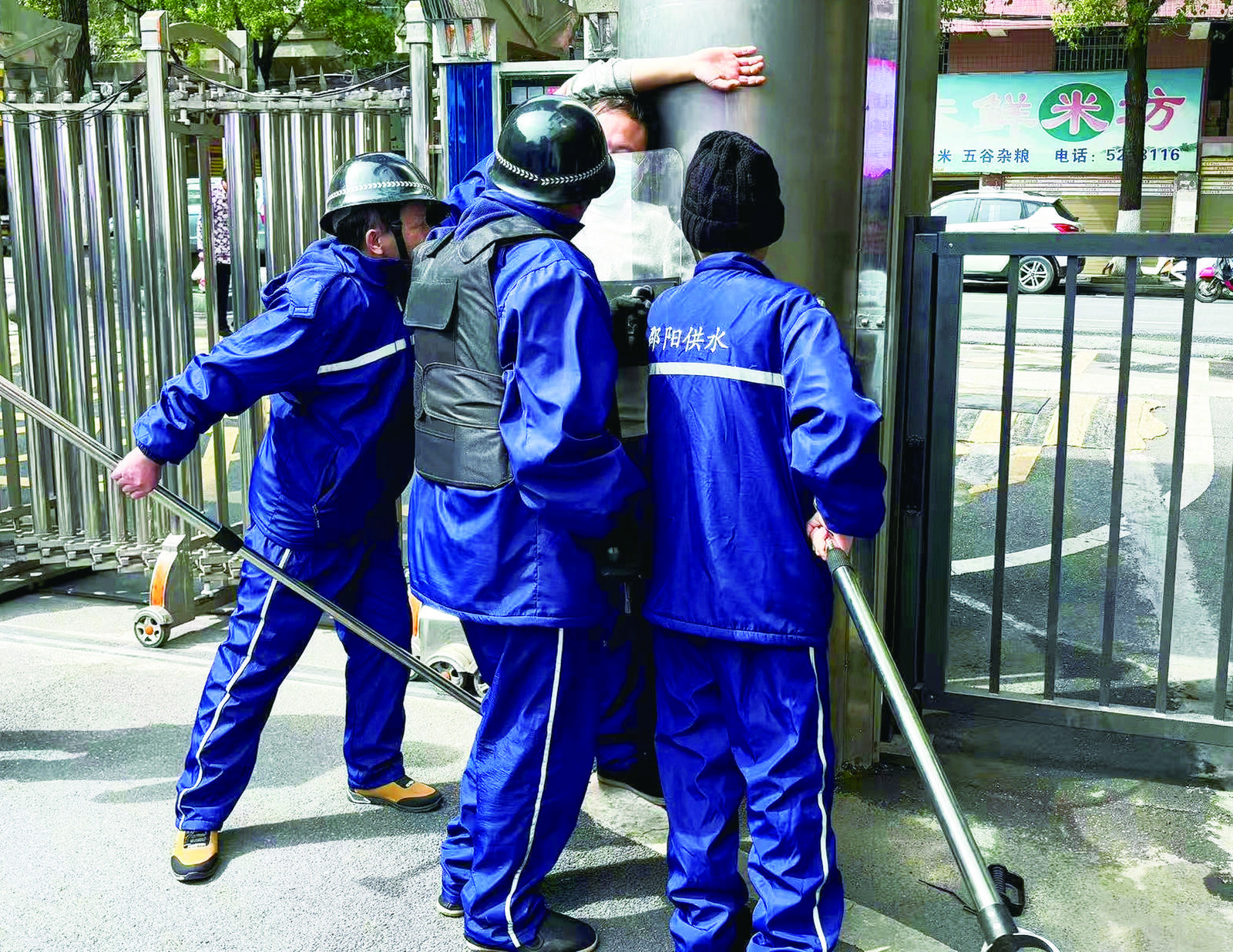 为提升员工反恐防范意识和应急处置能力,确保供水安全,市自来水公司与市公安局双清分局工业街派出所近日联合举行了反恐应急培训和演练。图为安保人员使用防暴器械,成功制服“恐怖分子”。
