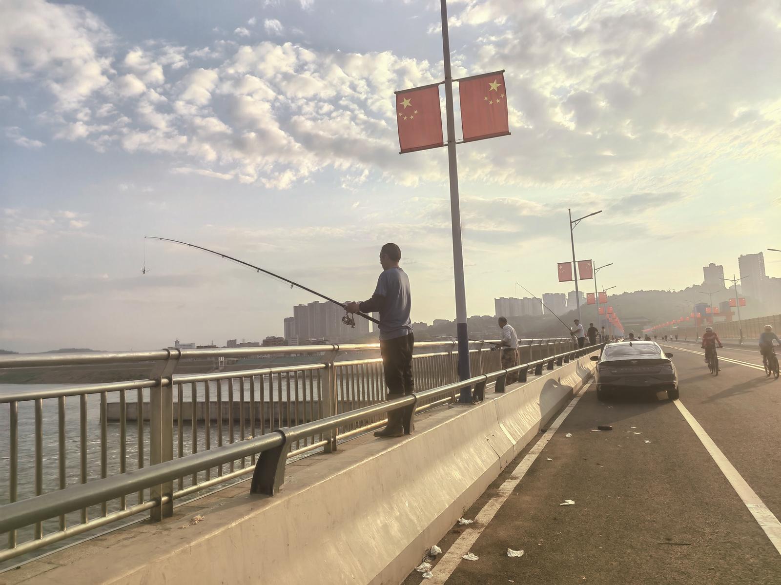 近期,市民反映,有不少人到犬木塘水库坝顶公路桥上钓鱼,垂钓者采取一杆多钩或者一人多杆方式钓鱼,垂钓期间还产生不少生活垃圾,希望有关部门能够管一管。图为5月20日早上,在犬木塘水库坝顶公路桥上的垂钓者。