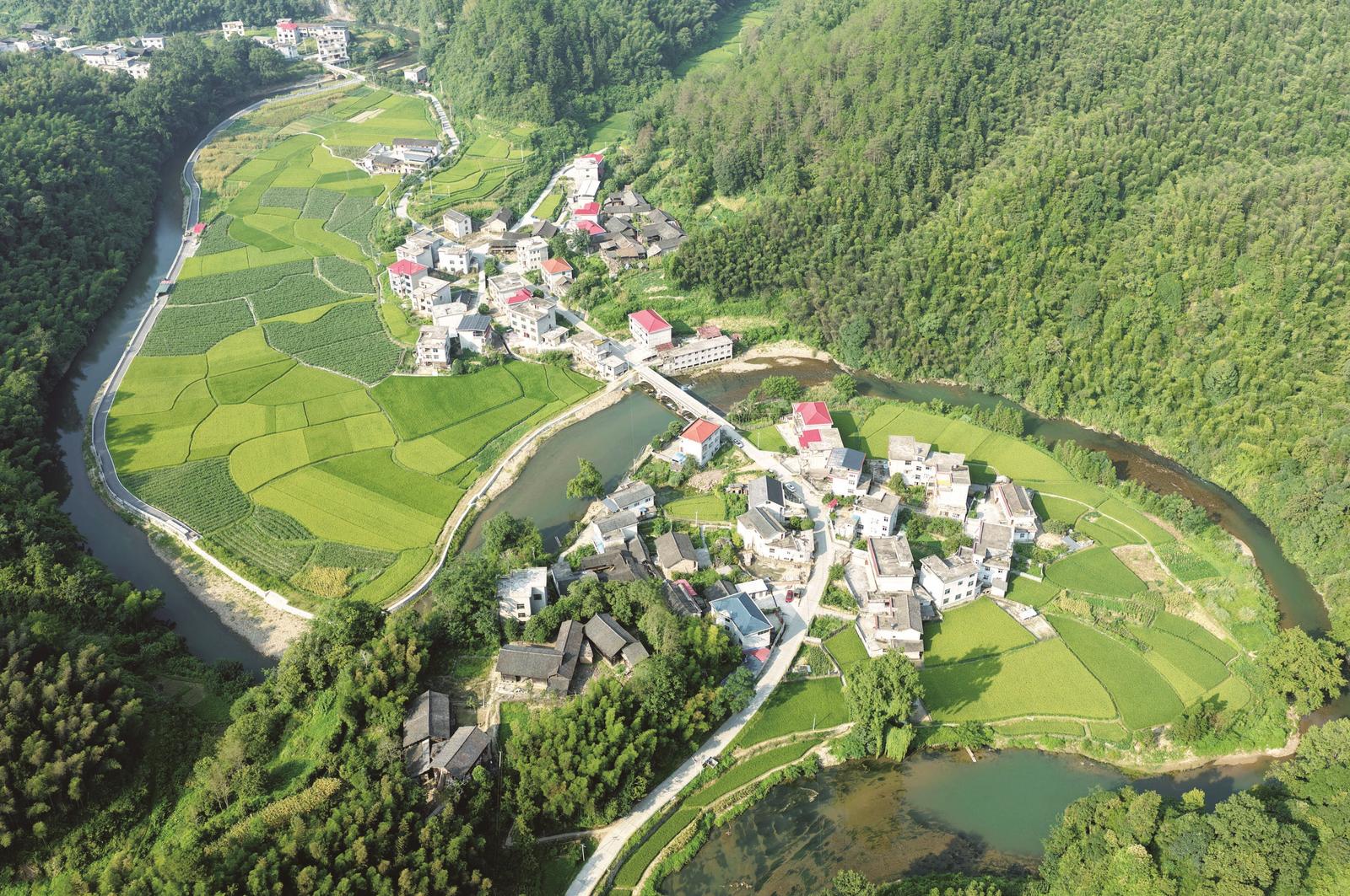 8月5日,俯瞰城步苗族自治县蒋坊乡大同村,翠绿的山林、蜿蜒的河流、金黄的稻田、通达的道路与错落的民居构成一幅生机盎然的夏日美丽画卷。
