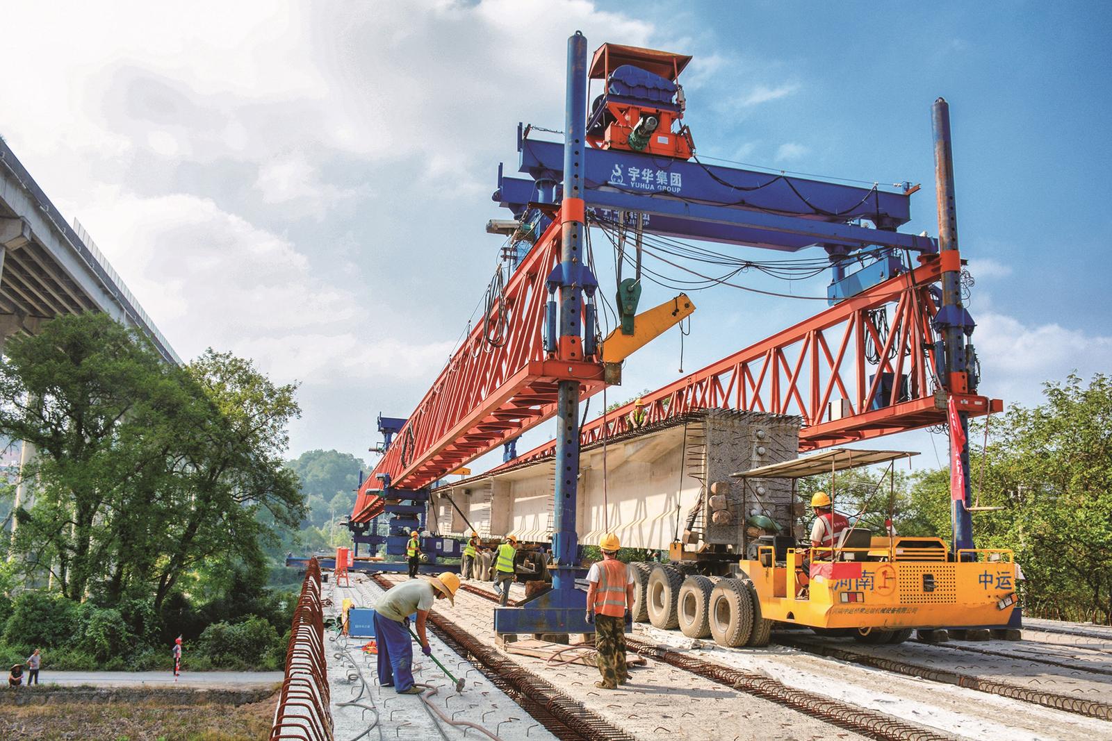10月16日,在新宁县金石镇渡潭村虞家桥附近的夫夷江上,新新高速公路二标段崀山互通引线的虞家桥跨江高架大桥正进行第3跨第18片箱梁的铺架。该桥与G59呼北高速公路跨江高架桥并行,是该公路最后一座跨江高架桥,预计本月下旬完成箱梁铺架。