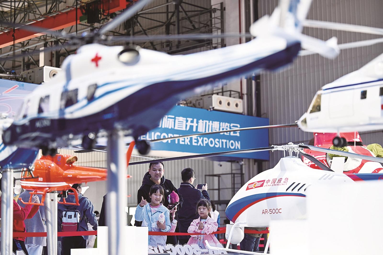 观众在天津直博会直升机馆内参观
