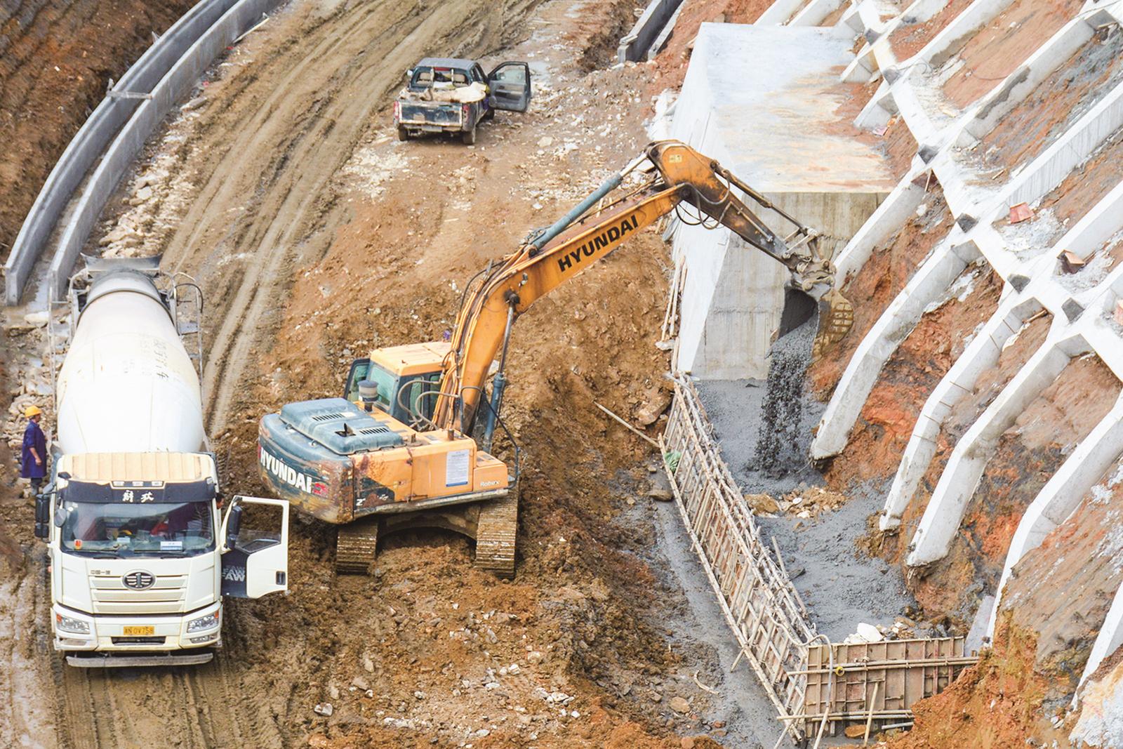 11月5日,在新宁县金石镇水头村新新高速公路二标段崀山互通枢纽收费站建设工地,施工人员正在浇筑混凝土护坡。据悉,该建设工程预计年底建成通车。