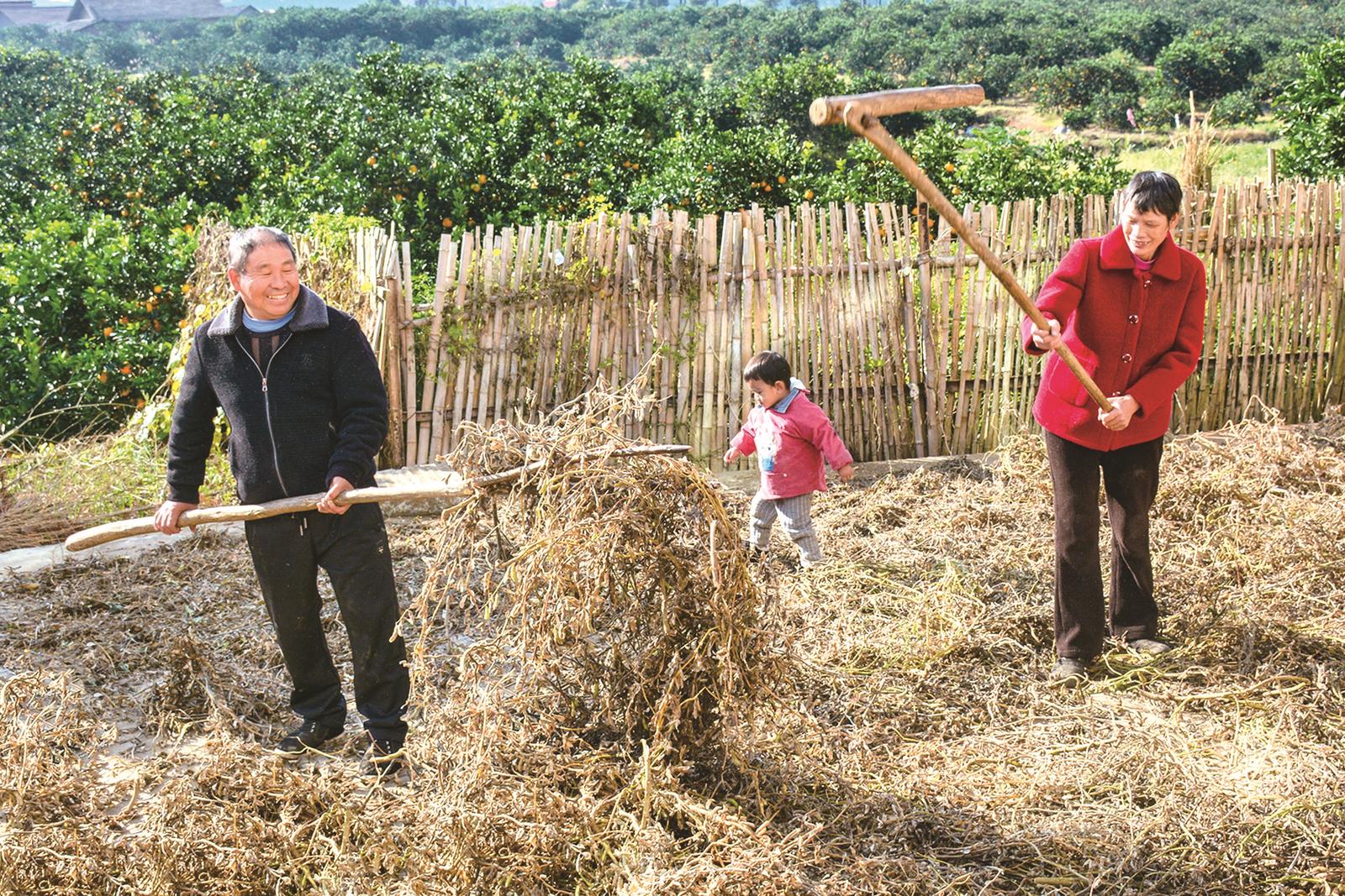 11月14日,新宁县黄龙镇沉水村村民唐桂华与丈夫利用晴好天气,在屋前晾晒黄豆。今年,该村大力推广良种黄豆种植,迎来丰收。目前正值收获季,村民们纷纷抢抓农时采收、翻晒,确保颗粒归仓。