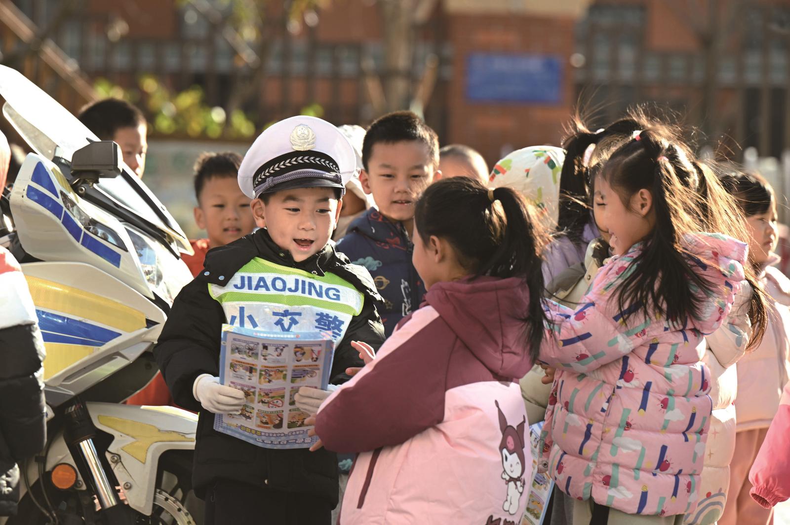 12月2日是“全国交通安全日”。连日来,各地举办各类交通安全主题活动。图为12月2日,在河北省石家庄市新华区柏林幼儿园,一名“小交警”给小朋友发放交通安全宣传页。