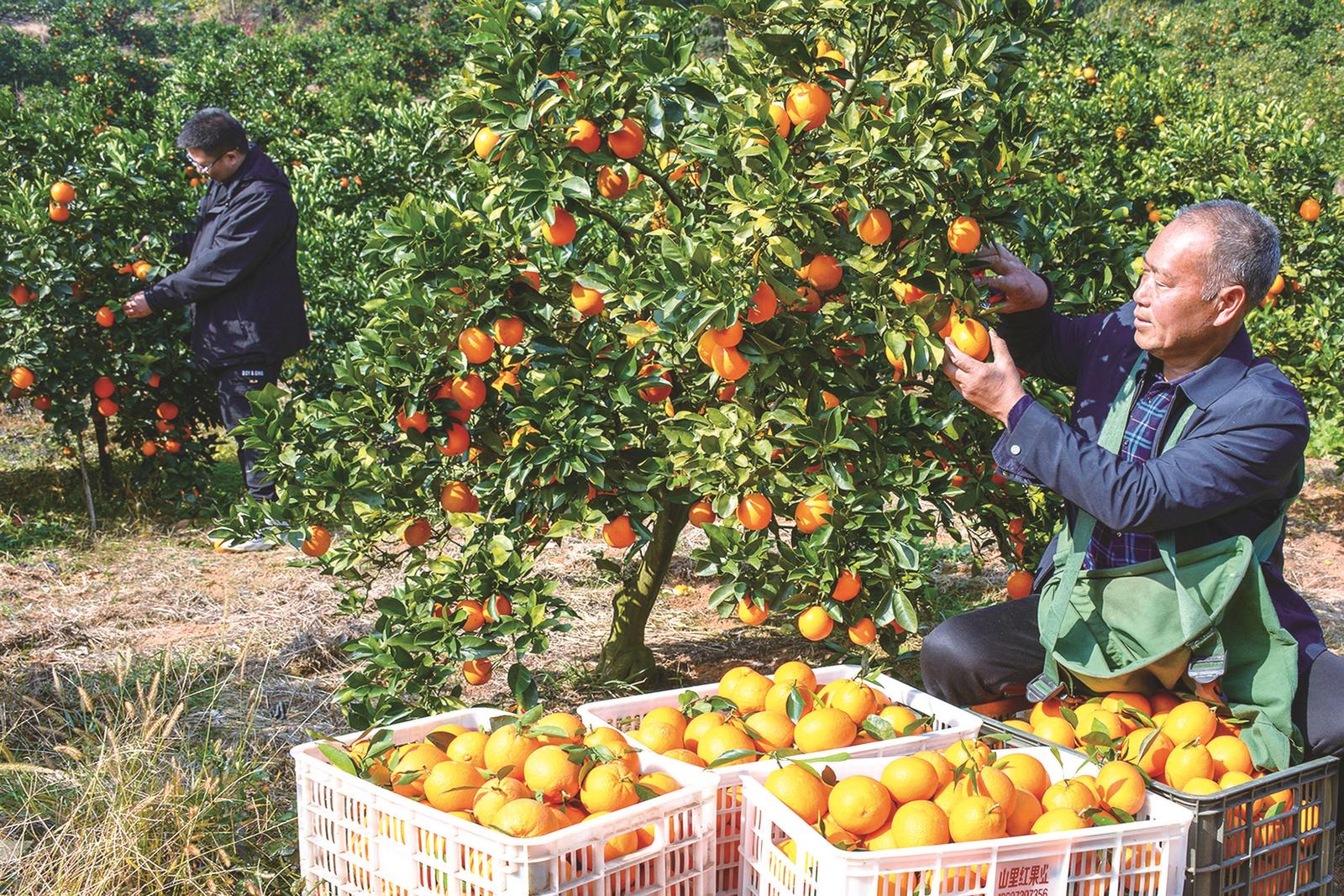 12月6日,新宁县黄龙镇沉水村种植专业户陈锡来在采摘红心脐橙。今年,他种植的红心脐橙进入线上销售旺季,预计全年网络销量可达20万公斤,年产值超过200万元。陈锡来也因此获评该县脐橙电商销售带头人。