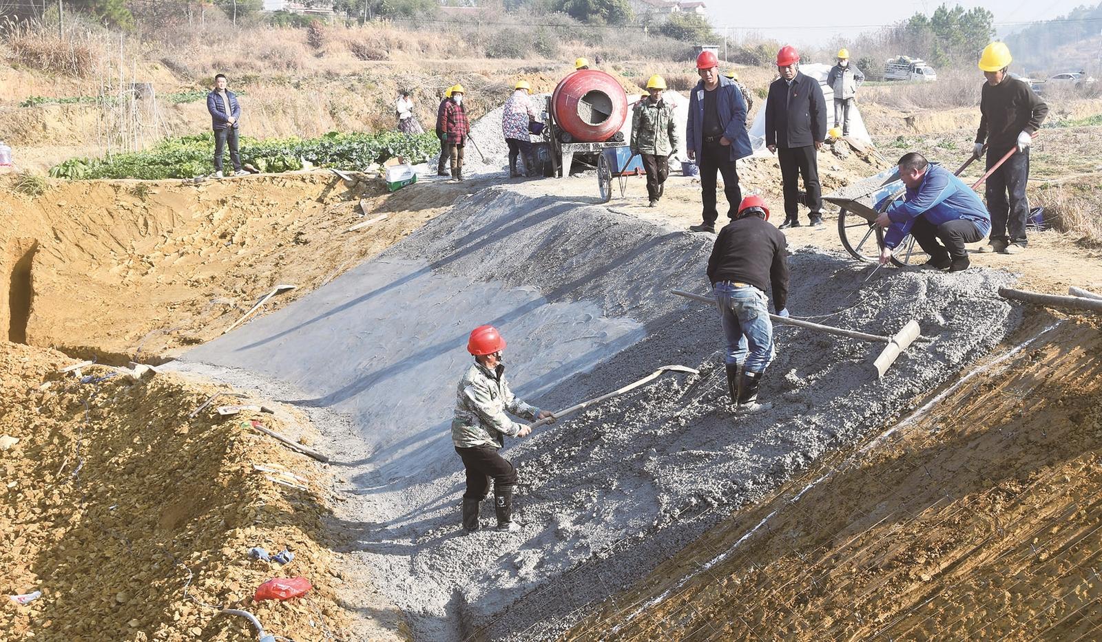 1月14日,在新邵县小塘镇留田村,民工正在对山塘坝基进行硬化。眼下,留田村2026年农村中小型公益性基础设施建设以工代赈项目正紧锣密鼓推进。该项目总投资480万元,计划整修20口山塘、疏浚维修6.5公里水渠。目前,已完成6口山塘整修,水渠疏浚项目即将动工。
