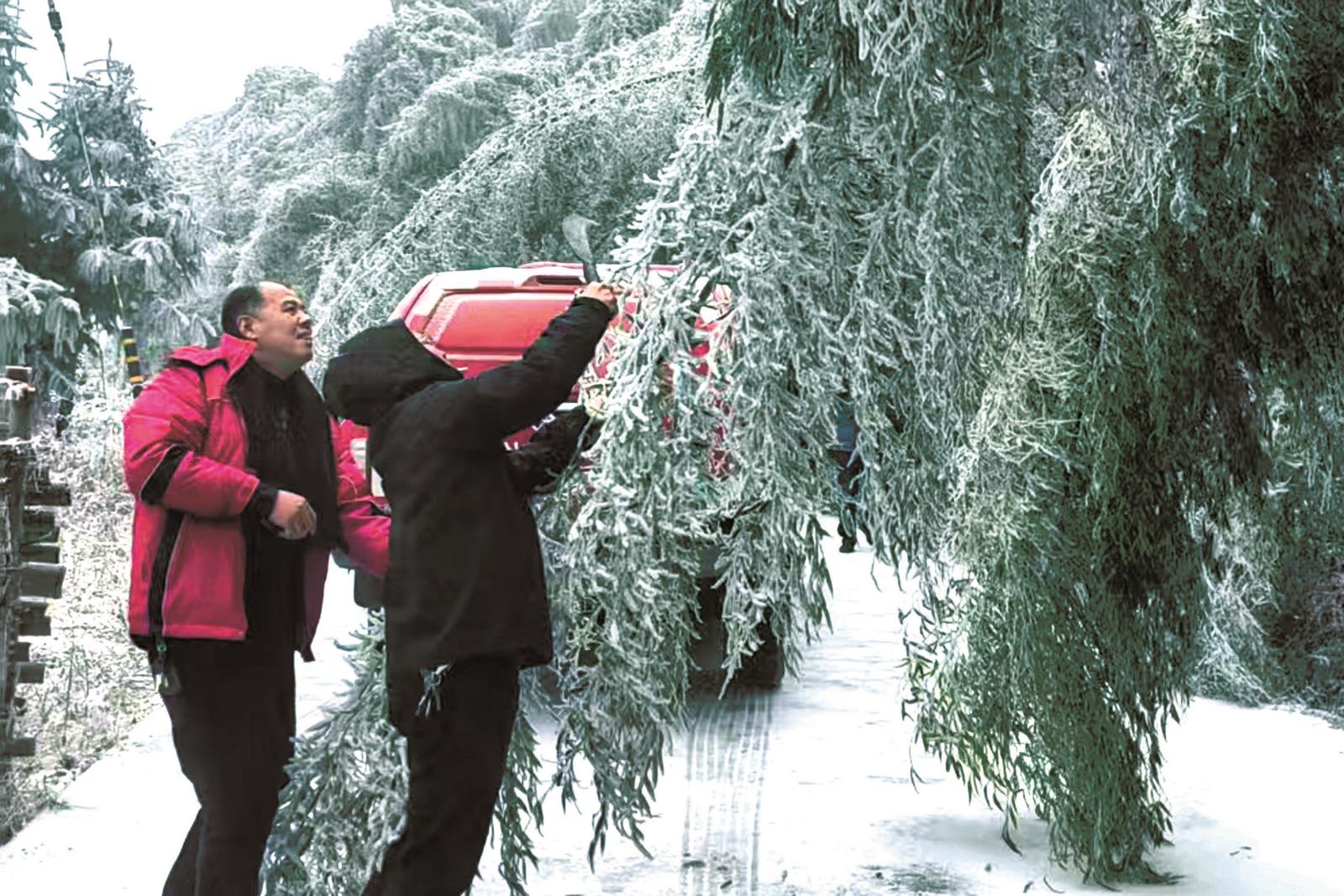 1月21日,南山国家公园候选区新宁县舜皇山片区组织全体管理人员清理太平桥至七家岭沿线冰冻倒伏的南竹,保障道路通畅。