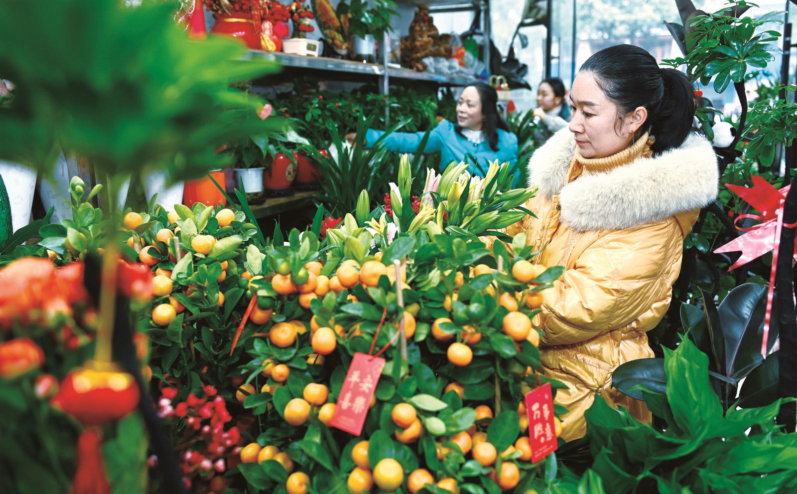 1月29日,市民在武冈市水西门街道花卉市场选购年宵花。随着春节临近,当地各花卉市场的鲜花绿植等日渐走俏,许多市民前来选购花卉装饰居室,增添新春佳节喜庆祥和氛围。