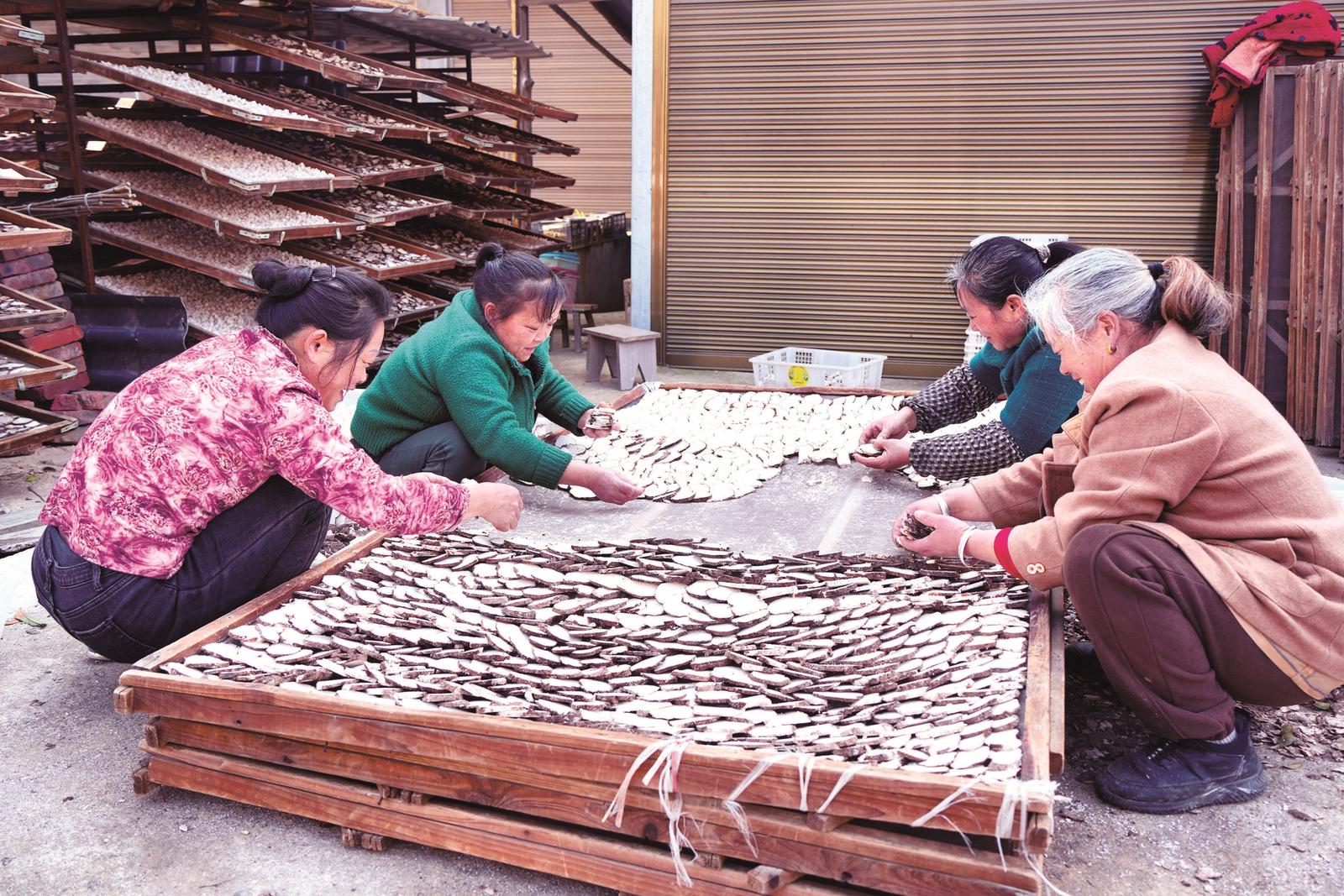 3月13日,在绥宁县乐安铺苗族侗族乡大团村的中药材加工作坊里,村民们忙着分拣、去皮、切丁,将茯苓加工成助农增收的“金疙瘩”。