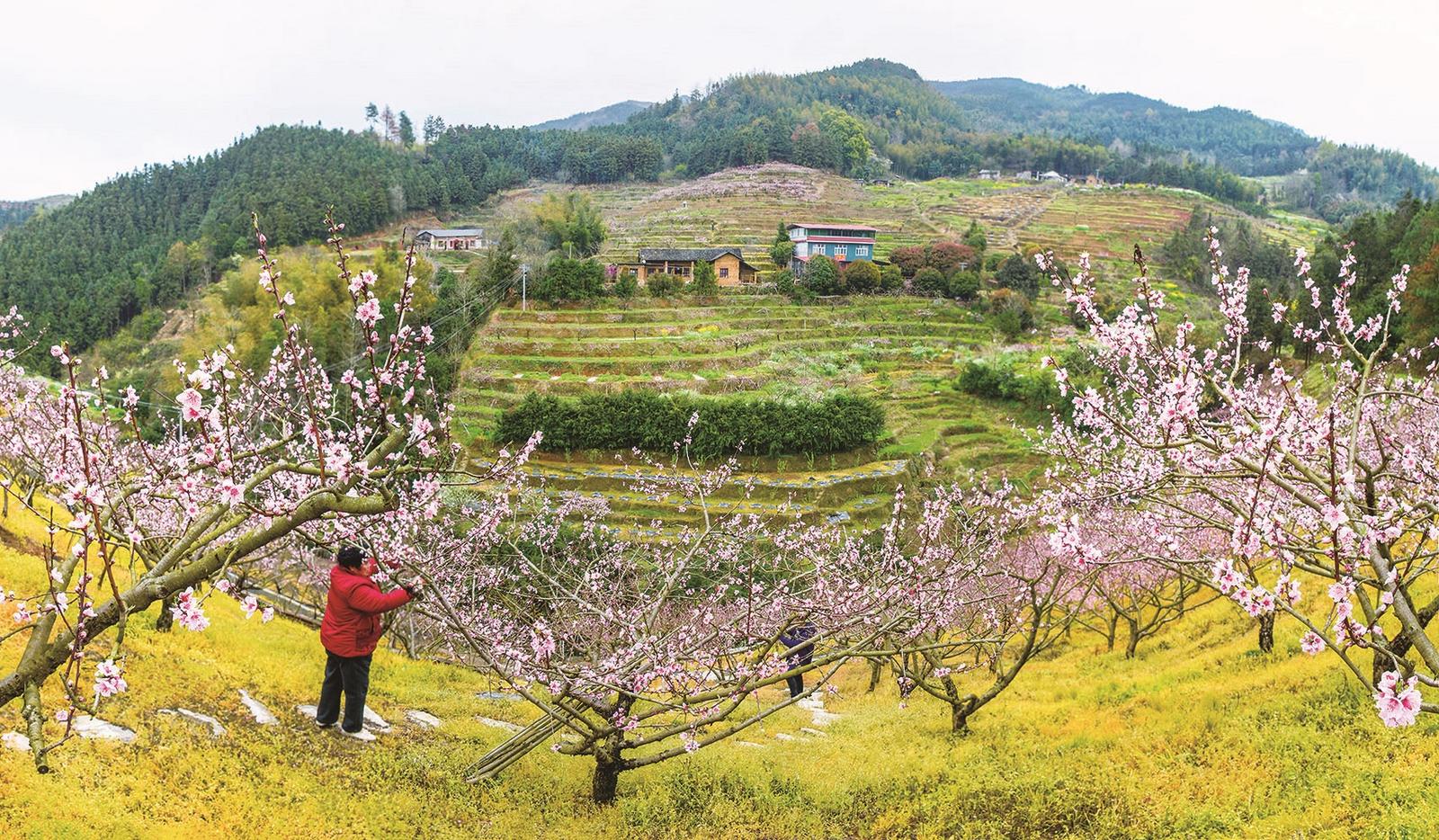 眼下,新宁县金石镇金夷村村民李修文种植的6.67公顷桃树正值花开时节,来此踏青赏花的游客络绎不绝。图为3月21日,不少游客到此赏花,沉浸式感受春天的诗意画卷。