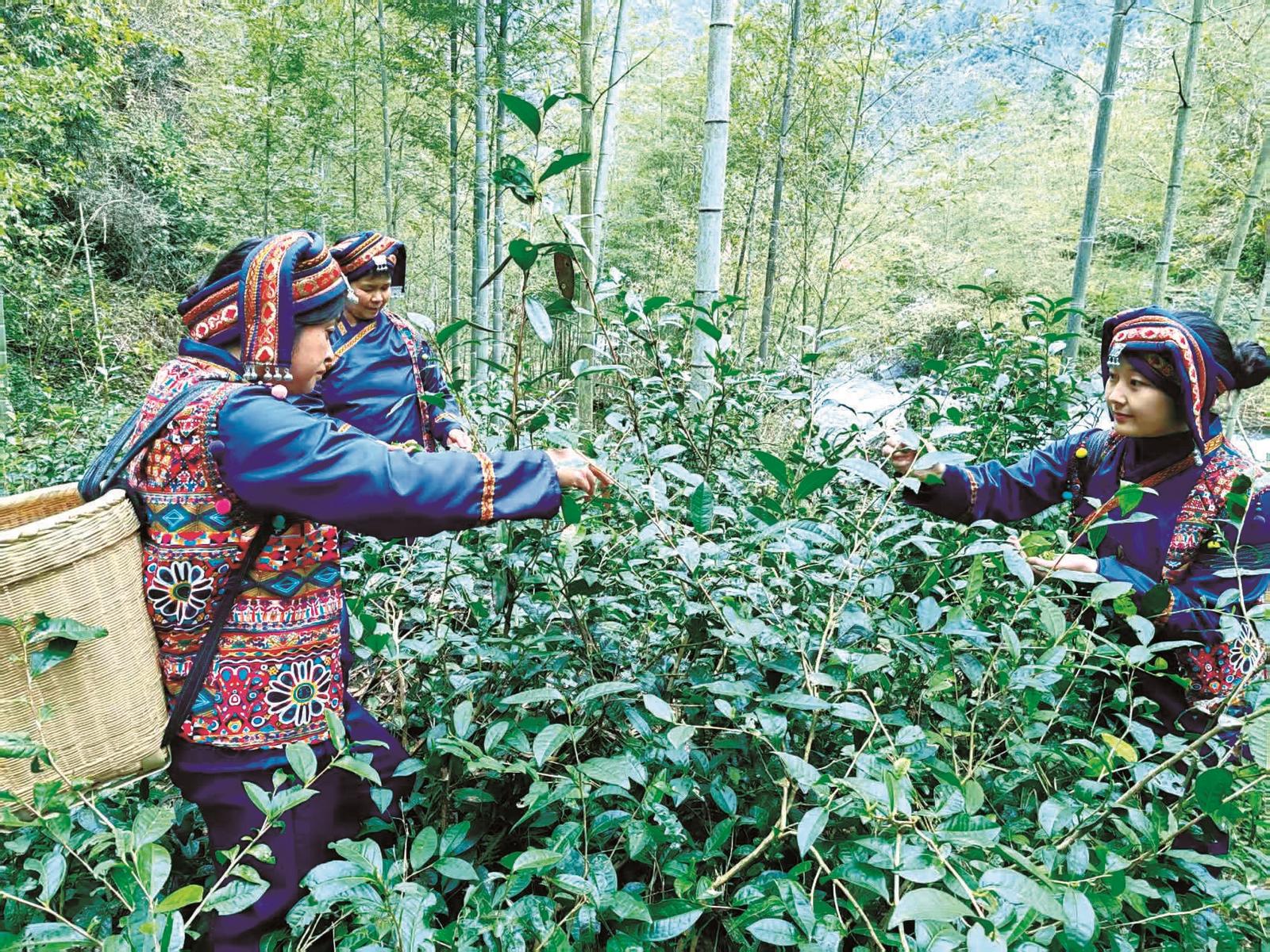 3月28日,第五届舜皇山野茶开采节暨“片叶度关山”万里茶路中国行启动仪式在新宁县舜皇山林场紫花坪举办,身着民族服饰的采茶人穿梭在山林间,采摘鲜嫩的野茶芽叶。