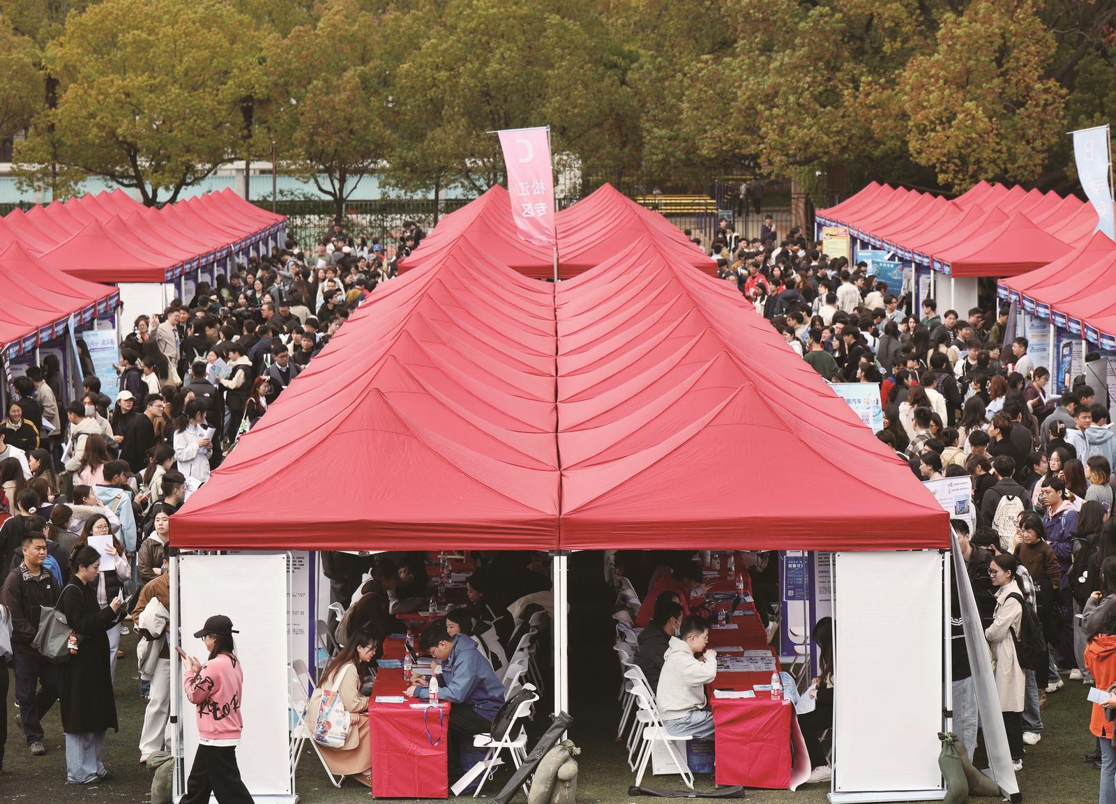 3月31日,2026上海高校毕业生“春季促就业攻坚行动”暨就业实习招聘会在上海师范大学徐汇校区举行。本次招聘会吸引800余家用人单位参加,涵盖集成电路、生物医药、人工智能、金融服务、教育行业、信息技术等领域。3月31日拍摄的招聘会现场。