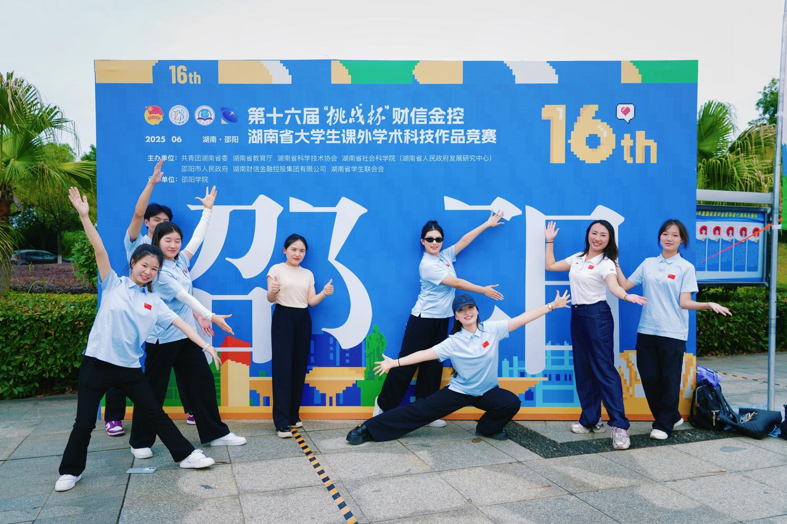 参赛团队在第十六届“挑战杯”财信金控湖南省大学生课外学术科技作品竞赛主题展板前打卡。 邵阳日报记者 刘昌鸿 摄