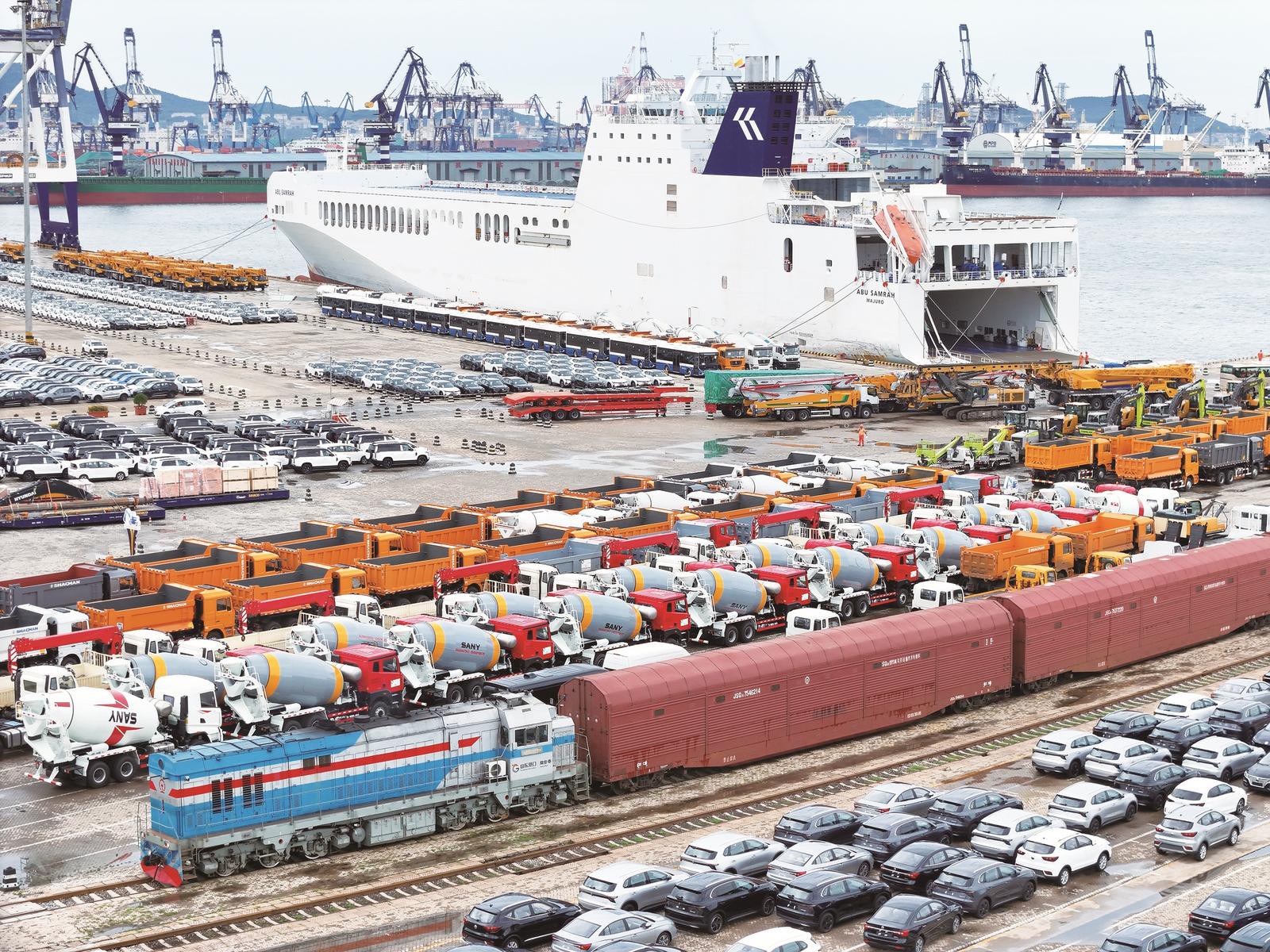 连日来,在山东港口烟台港,大批出口车辆集结待发,汽车运输船穿梭往来,一派繁忙景象。今年1-5月,烟台港完成商品车运量29.6万辆。目前,烟台港已实现全球主要商品车码头全覆盖、全联通,形成“以航线带货源、以货源促航线”的良性循环。6月29日,汽车运输船在山东港口烟台港装运出口汽车(无人机照片)。