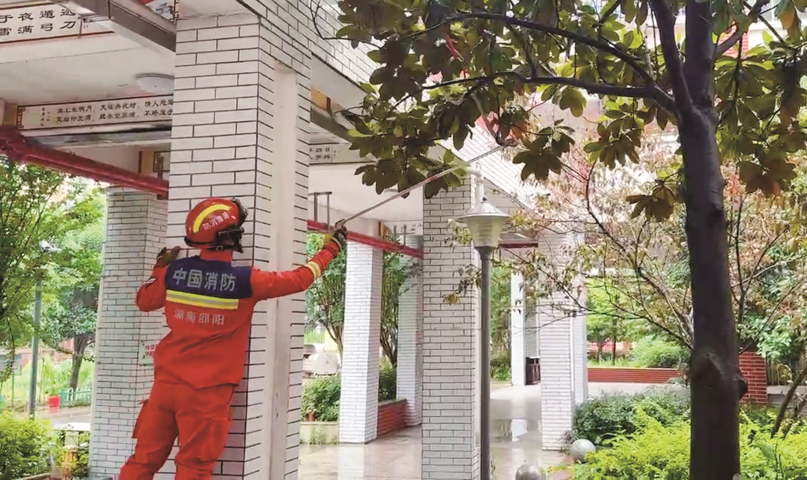 ▲5月15日,邵东市宋家塘街道某小区有蛇扰民,消防救援人员接警后第一时间赶到现场处置。 邵阳日报记者 申兴刚 摄