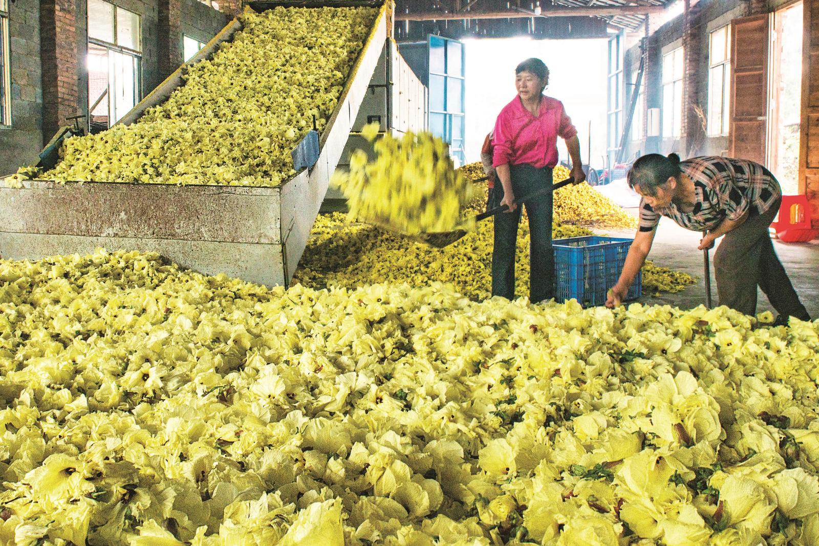 9月11日,武冈市文坪镇民富专业合作社的员工正忙着加工黄蜀葵。黄蜀葵是一种药食同源的中药材,应用前景广阔,经济效益显著。今年,该合作社带动周边10多个村庄、近千名留守妇女参与生产,共同助力乡村振兴。
