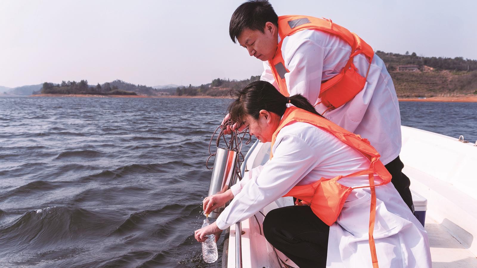 ▲邵东市自来水公司工作人员在黄家坝水库采集水样进行水质检测。 殷文斌 摄