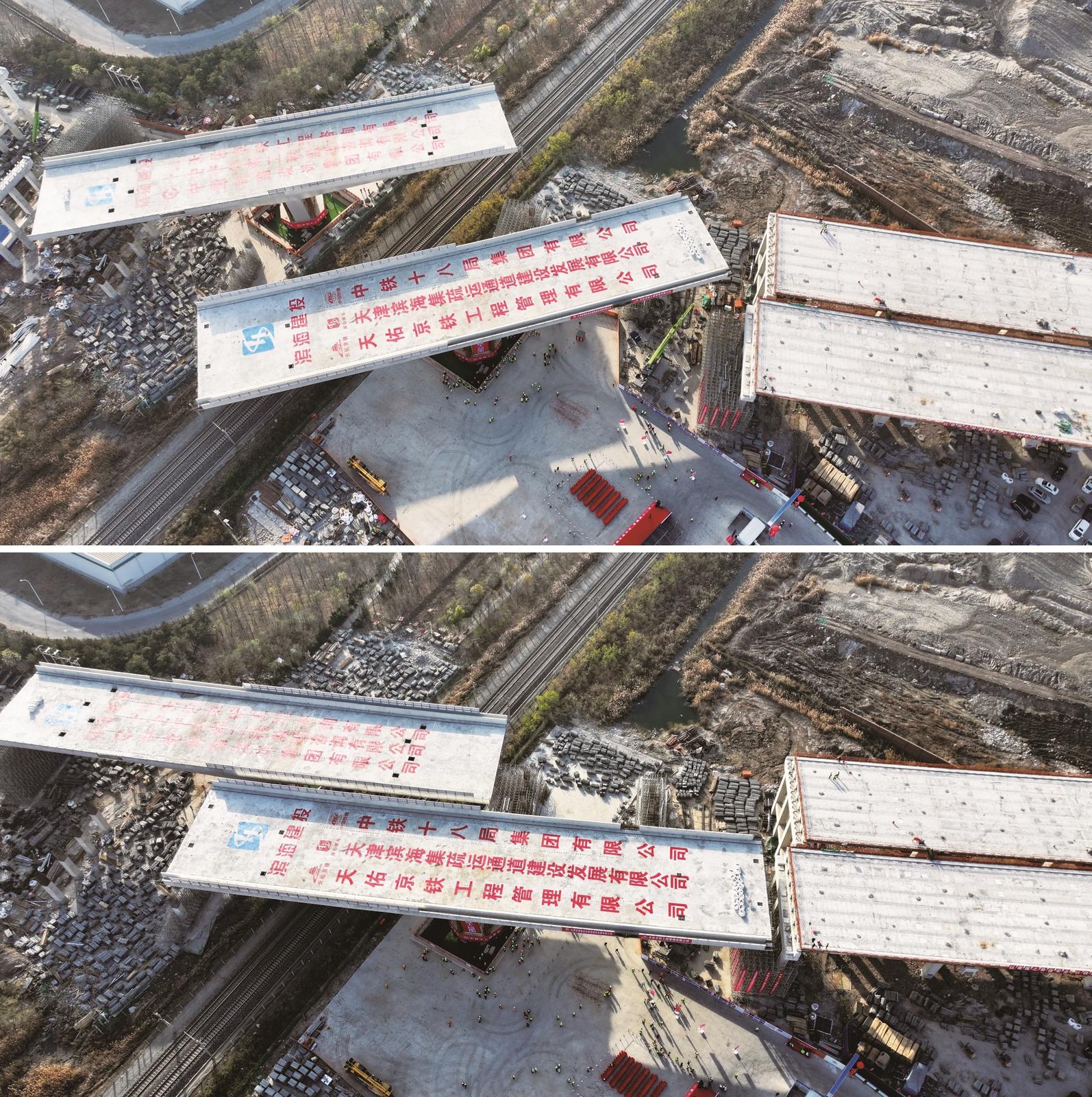 11月26日,由天津滨海建投基建管理有限公司负责建设的兴港高速上跨津山铁路转体桥工程完成转体施工。工程承建方中铁十八局仅耗时约1小时便将两座重1.4万吨的转体连续梁,同步顺时针旋转60余度实现“完美转身”。