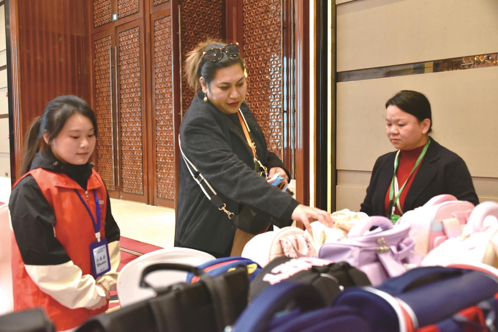 采购商在企业展位前,了解箱包详情。 王秀丽 摄