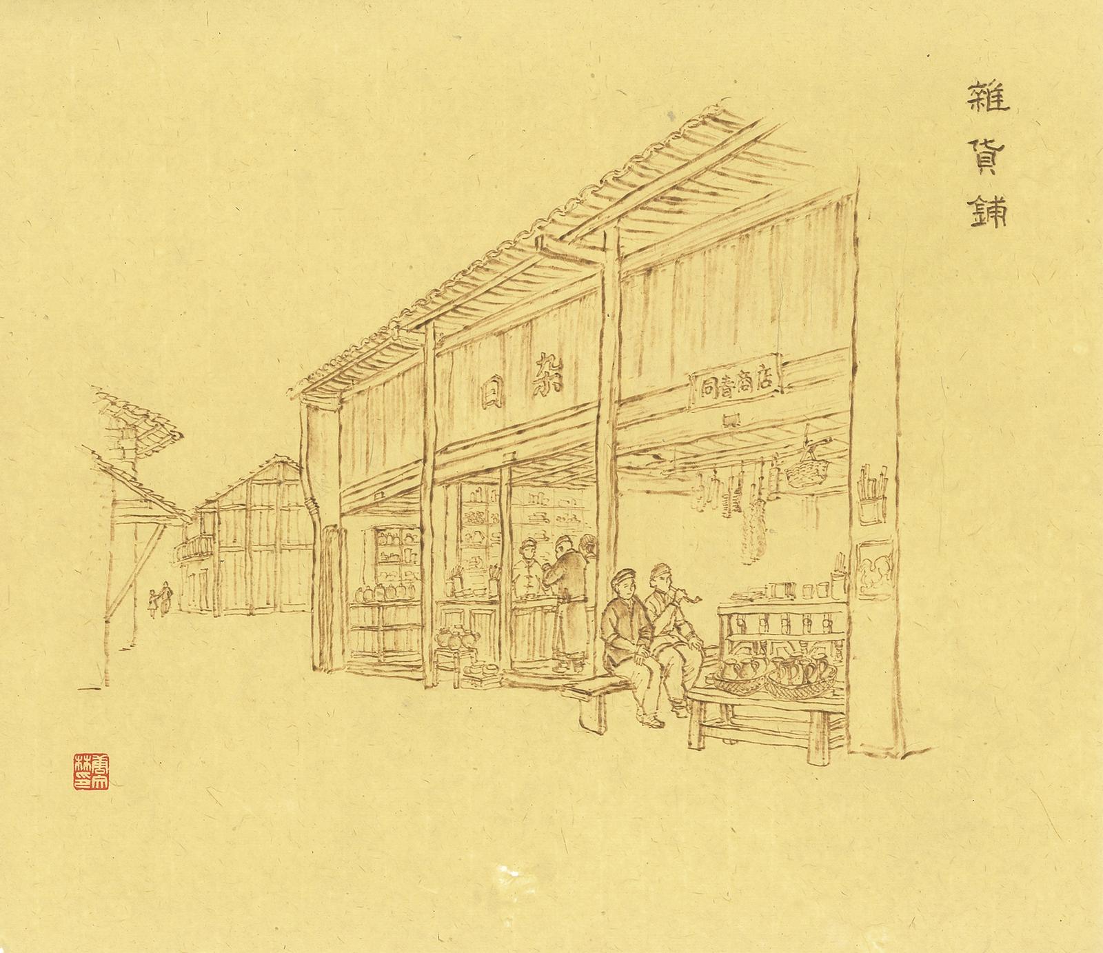 贩卖各种杂货的小店,称为杂货铺。杂货铺之特色,就是“麻雀虽小、五脏俱全”,从瓷盘、瓷碗、泥瓦盆,到铁炒锅、铝饭勺、笼屉、痰盂,甚至到推婴儿的竹制车,可说是一应俱全。