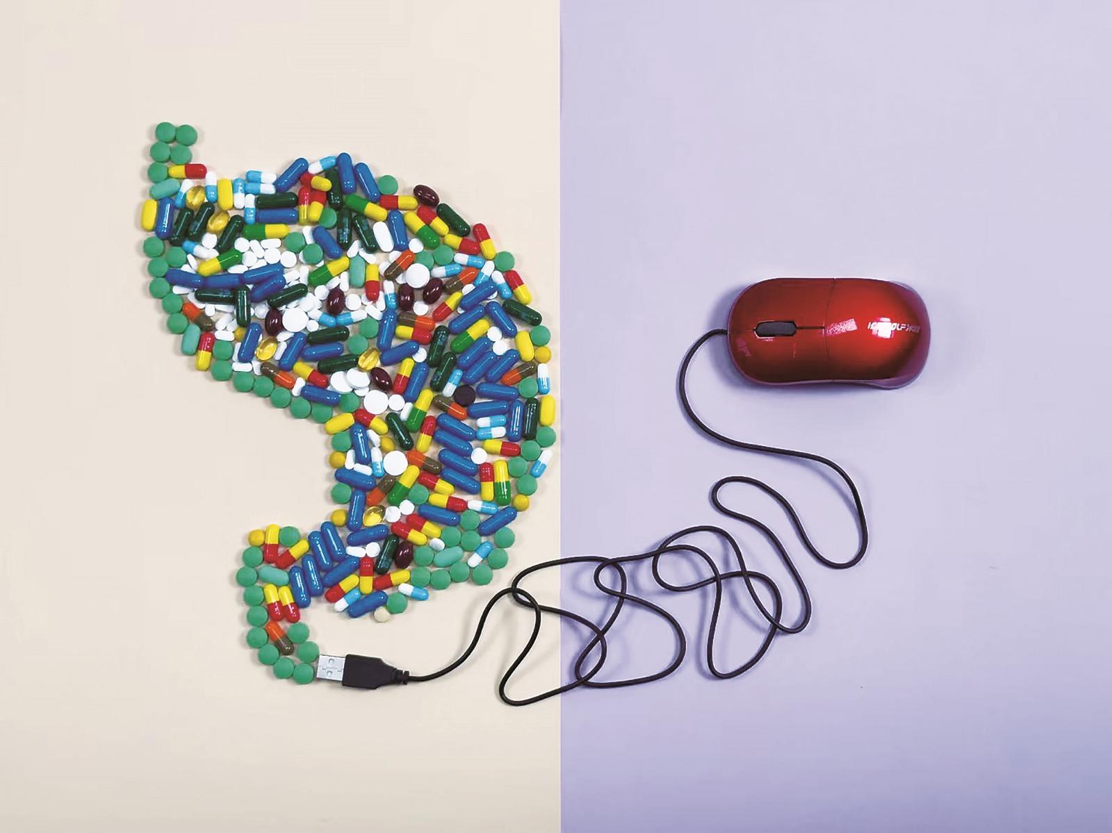 将药物组合成胃与像肠子蜿蜒的鼠标线缆结合,也隐喻人体器官胃和肠,表达了健康与科技的联系、药物治疗与生活方式的反思、创意与艺术表现等多方面的思想,同时引发观众对现代生活方式的反思,以及对如何平衡科技与健康关系的思考。