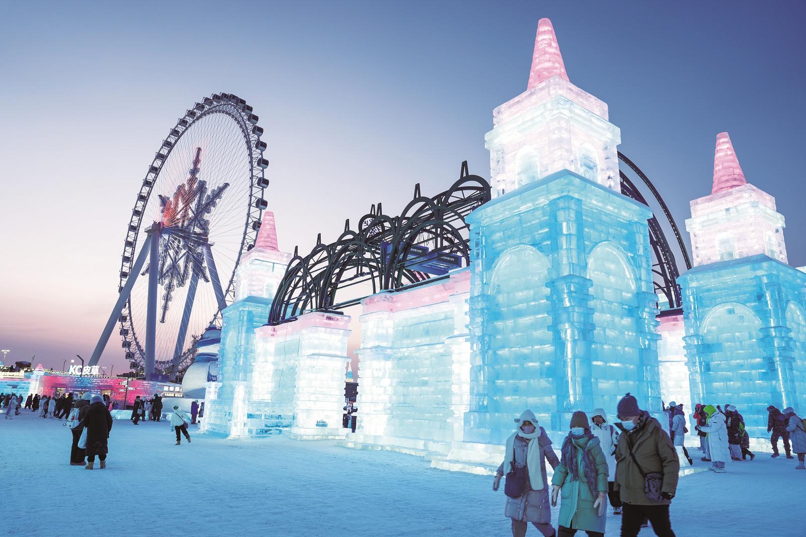 寒冬时节,哈尔滨冰雪大世界园区流光溢彩,吸引了来自天南海北的游客观赏游玩,畅享冰情雪趣。图为1月27日拍摄的哈尔滨冰雪大世界园区内的冰雪景观。