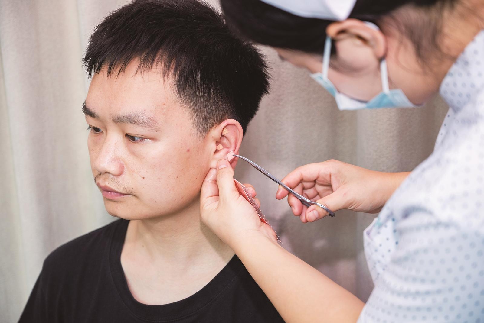 护士正在为失眠患者进行耳穴压豆治疗。