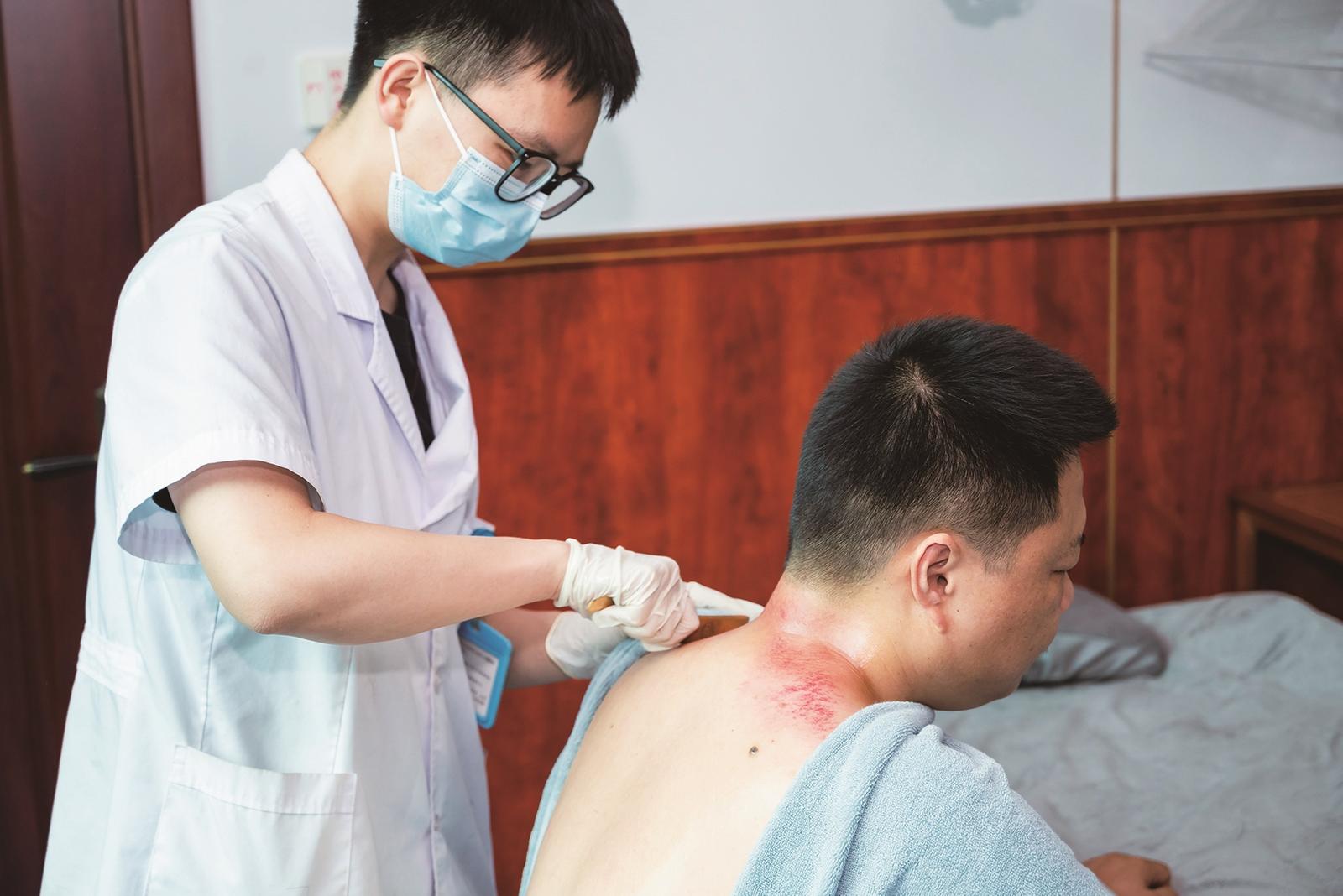 治疗师为失眠患者进行背部刮痧,帮助其泻火除烦,宁心安神。