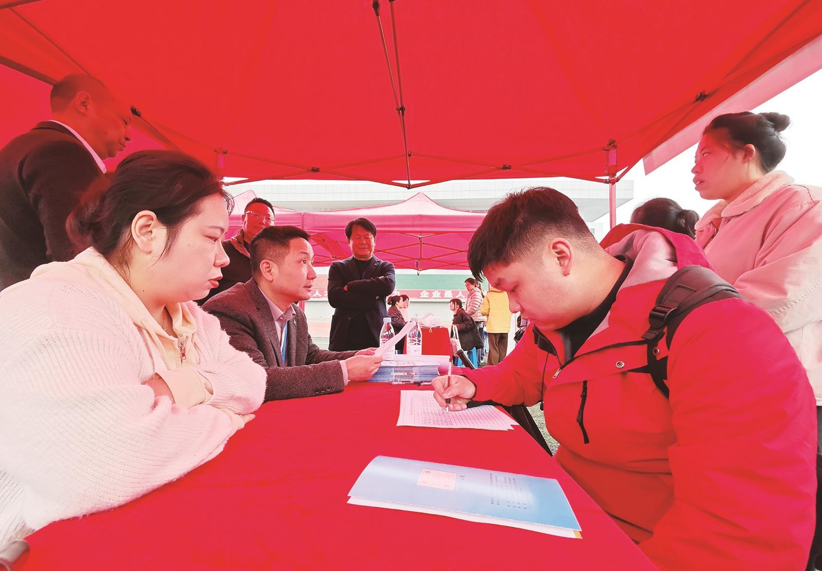一位求职学生在市金秋方舟高级中学招聘咨询台前填写个人信息。