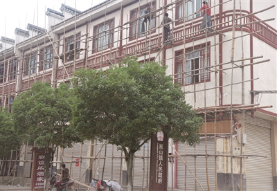 5月30日,新宁县崀山镇窑市街,施工人员正在为房子“洗澡”。该镇为了给游客一个美好的环境,每年清洗一次景区的房子。