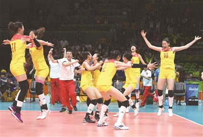 8月20日,在2016年里约奥运会女子排球决赛中,中国队以3比1战胜塞尔维亚队,夺得冠军。实现了12年重获奥运冠军的梦想,这是中国队球员庆祝夺冠。