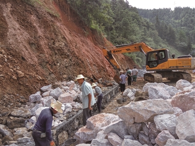 8月19日上午,城步城贝公路汀坪段,该县公路局人员正对塌方路段进行抢修。之前,该路段塌方,导致路面只能半幅通行且存在安全隐患。8月17日,公路部门对其进行隐患排除施工,预计半个月内完工。