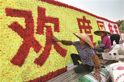 9月25日,工作人员在北塔区西湖桥头加紧施工,摆花造景。据悉,为热烈庆祝中华人民共和国成立67周年,喜迎我市第十一次党代会胜利召开,市区部分主要地段将摆花造景,营造喜庆祥和的节日气氛。