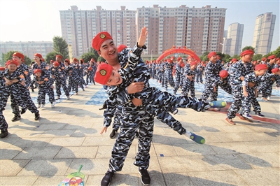 9月25日,“小小新兵”和“老兵”一起互动做军事训练。当日,市区诺贝尔幼儿园举办“梦幻海陆空,快乐父子兵”迎国庆大型国防军事亲子运动会,培养孩子们爱国爱家意识。