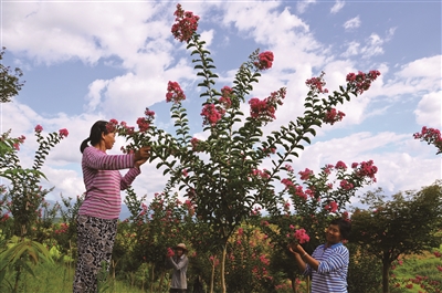 7月17日,游客正在新宁县金石镇隘头村张家岭林场源丰公司紫薇园里赏花。近日,该村源丰公司300亩连片红紫薇竞相开放,前往观光赏花的游客络绎不绝。
