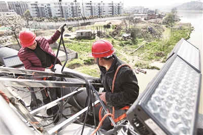 3月22日,施工人员在雪峰大桥侧边加紧安装桥体景观彩灯。