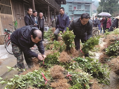 近年来,洞口县古楼乡依托“企业+基地+贫困户”的模式大力发展茶叶产业,通过种植生产优质雪峰云雾茶,带动山区贫困户脱贫。今年,该乡又通过多方筹措资金,购回茶叶树苗50万株,免费发给贫困农户新建茶园200余亩。 图为3月17日,村民们在领茶苗。