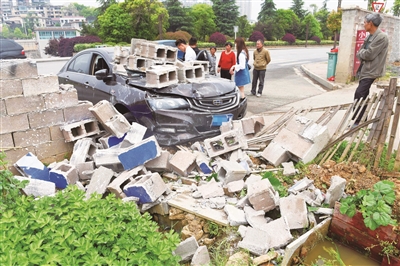 4月11日12时许,在市区邵水东路拦河坝附近路段,一辆小车一不小心撞倒路边围墙,所幸车上人员无大碍。目前,交警正在进一步调查当中。图为事发现场。