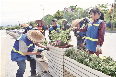 为扮靓城市,迎接“五一”国际劳动节的到来,园林工人对市区主街干道摆放的鲜花进行更换。