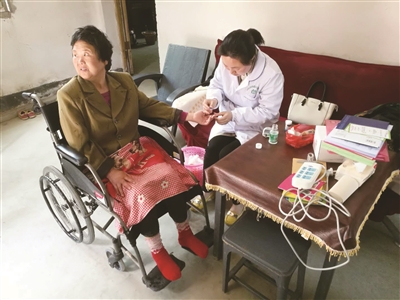 4月18日下午,邵阳市双清区石桥街道白马村村级服务大厅,党员志愿者与社区卫生服务中心工作人员认真为贫困户测量血压、询问身体状况。4月9日以来,该街道全体党员参与义诊服务,持续一周为502名贫困对象进行免费体检,将党建与扶贫工作有机结合。