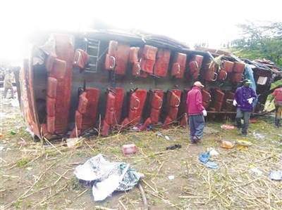 10月10日,在肯尼亚凯里乔郡,一辆大巴车发生严重交通事故,造成至少50人死亡、14人受伤。图为救援人员在交通事故现场工作。 新华社发