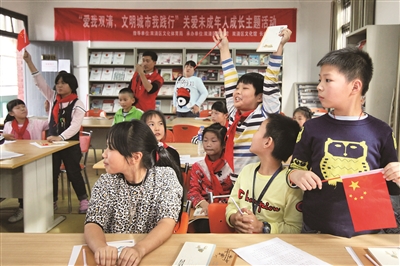 10月30日下午,双清区图书馆、文化馆、长岭社区联合主办“兴趣活动我参与,文明城市我践行”关爱未成年人成长主题活动,青年志愿者组织孩子们进行了《声律启蒙》朗诵、看图识成语等有奖游艺活动,开展了“创建全国文明城市”基础常识抢答赛。图为孩子们踊跃抢答。