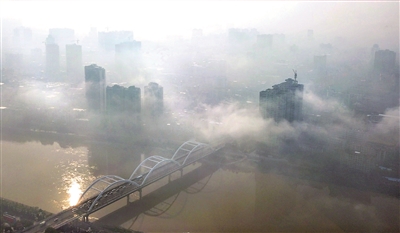 11月22日9时许,在白雾的衬托下,市区西湖桥及两岸的高楼犹如空中楼阁。这幅大自然的绝妙美景像一幅水墨画,让过往市民纷纷驻足欣赏、拍照。