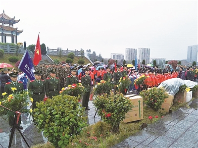 这一天,在新邵烈士陵园举行抗战英烈钟蔚文迁葬祭奠活动。邵阳县、新邵县有关部门领导、与英烈一起战斗的老兵、志愿者、群众学生代表、烈士亲属参加活动。