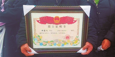 为获得更多有关钟蔚文的资料,钟金民及家人向中国第二历史档案馆发去了求助信,很快收到了钟蔚文战斗牺牲的具体经过。他的事迹英勇,为了中华民族,他流尽了最后一滴血。根据国家政策和文件精神,钟金民及家人想给钟蔚文争取烈士荣誉。在有关部门的帮助下,钟金民及家人们收集整理好了评烈资料,按程序进行了申报。2018年9月25日,湖南省人民政府评定钟蔚文为烈士。今年3月29日,远在甘肃的钟金民回到家乡,与家人们满怀喜悦和感激之情来到市退役军人事务局赠送锦旗。
