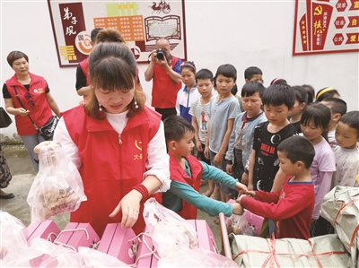 本报讯 5月31日,新邵县教育工会、市松坡图书馆、市大邵公益志愿者联合会、市益民社会工作服务中心等多家单位的志愿者,走进新邵县大新镇三和村岱山教学点,开展敬老爱幼公益活动,为当地的留守儿童和老人们带来快乐。