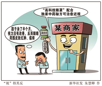 只要在近视患儿眼睛周围涂一层厚厚的药膏,戴上“降度镜”半小时,即可轻松治愈近视……湖南省人民医院眼视光医学中心王华教授遇到过很多陷入这种骗局的家长。他说,有商家声称“高科技眼罩”配合独家中药秘方可治愈近视,有的孩子涂了半个月,视力没有改善,反而眼睛周围皮肤红肿、瘙痒,到医院检查发现患上了过敏性皮炎。