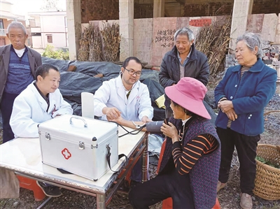 武冈市秦桥镇卫生院结合“不忘初心 牢记使命”主题教育活动,组织医务人员走村入户,宣传健康扶贫政策,为困难群众提供上门随访,免费体检等慢性病签约服务,使小病不出村,打通偏远山区乡村看病难最后一公里,受到村民欢迎。图为10月31日,该院医务人员正在秦桥镇新春村为村民上门看病。