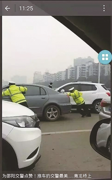 上月31日,一张两名“交警”在市区青龙桥推车前行的照片火爆了朋友圈,照片中一辆灰色小车停在青龙桥路中央,而两名“交警”使出浑身力气,几乎与地面成45°角。照片发出来之后,引来上百条好评和点赞,网友“水蓝”直呼“温暖”。