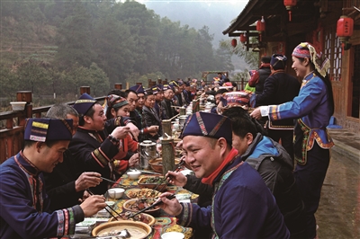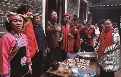 “这次来崀山过春节真的好开心,好玩好看好热闹,下次一定带爸爸妈妈一起来!”在崀山瑶寨品尝“瑶王宴”的游客队伍中,来自湖北武汉的帅小伙刘先生一脸兴奋地说。刘先生是和他的大学同学一起来崀山的。期间他们一起参加了当地政府举办的“崀山之春”联欢晚会,游览了八角寨、天一巷、辣椒峰、夫夷江等景区,进农家瑶寨品尝了“瑶王宴”、喝了竹筒酒,参加了瑶寨的篝火晚会,并体验了贴春联、打糍粑等活动,崀山浓浓的年味让他们流连忘返。